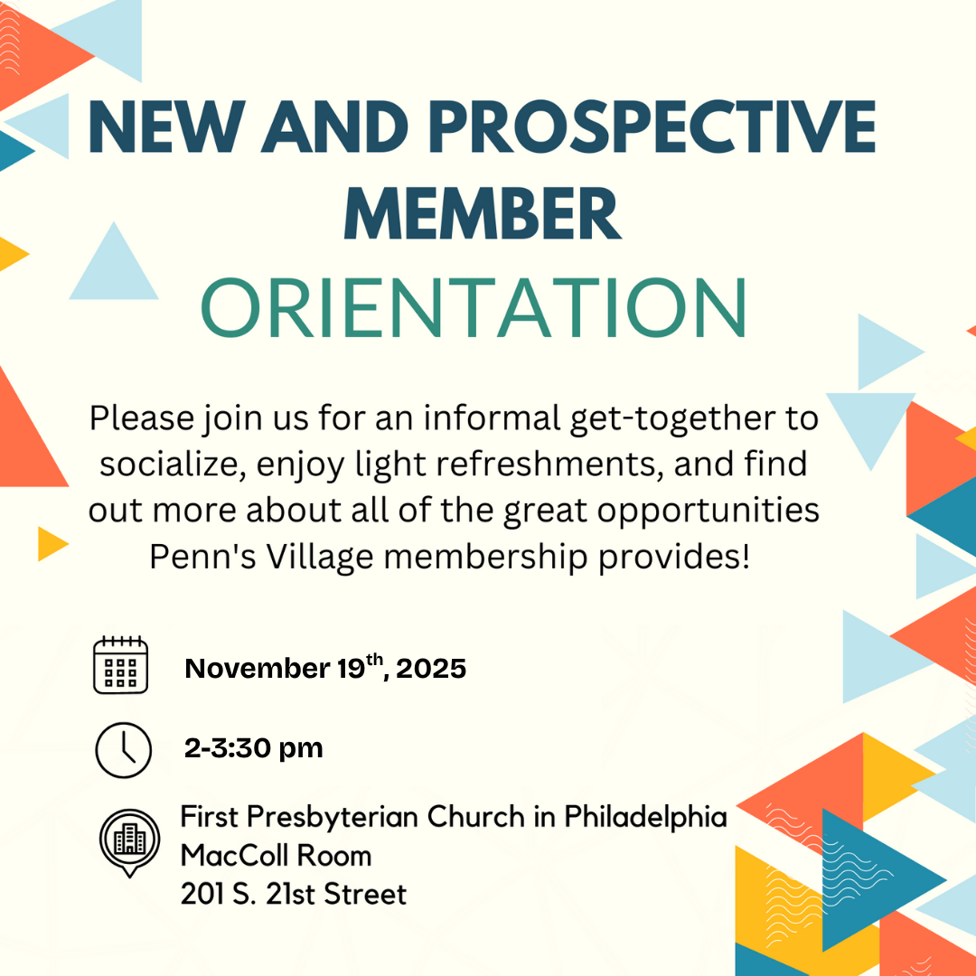 Register here: New Member Welcome & Orientation. You can also register by emailing info@pennsvillage.org or calling 215-925-7333. If you cannot attend, please cancel your reservation to make room for others.